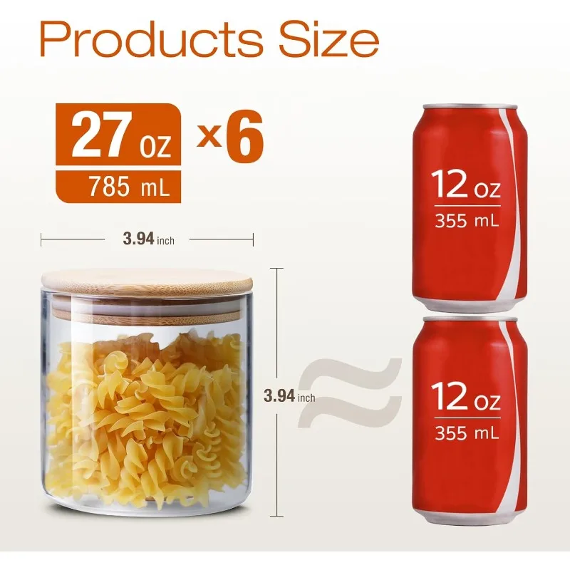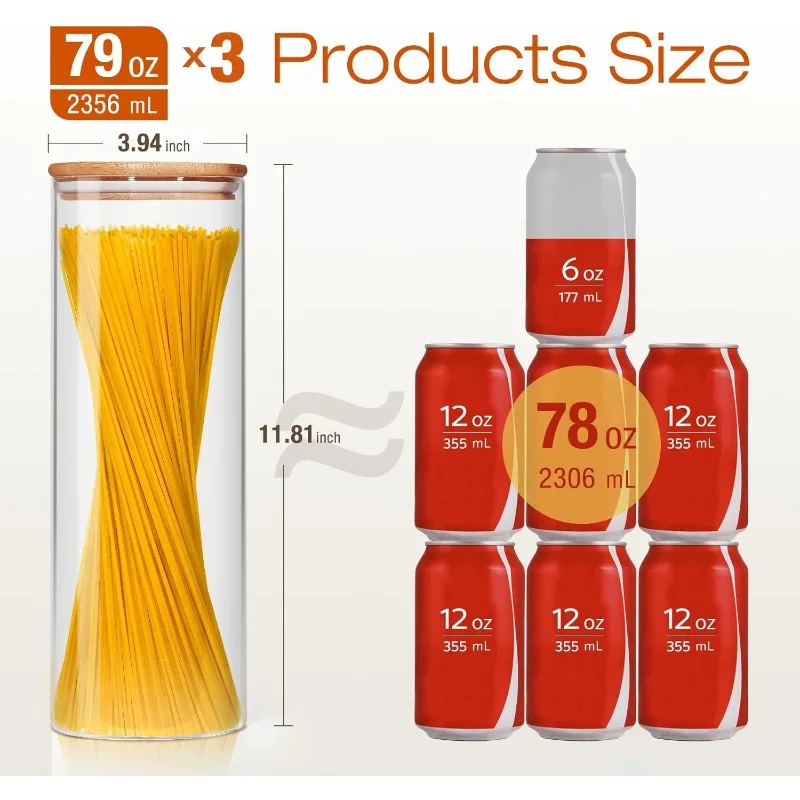 - Large Capacity Glass Jars with Bamboo Lids Set of 4: Glass containers with bamboo lids set of 4, 4x Large: 3.94 x 7.87 inch [about 53 floz], great for pasta, coffee, oats, cereal, flour, sugar, rice, candy, cookies, nuts, teas, etc. With 3.94" wide mouth design, you can easily refill with any type of foods
