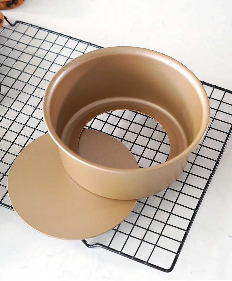 Bake beautiful cheesecakes, chiffon cakes, and layered desserts with this 6/8 inch round cake mold. Made from durable carbon steel with a golden finish and a removable bottom for easy release. Perfect for home bakers and DIY dessert lovers.