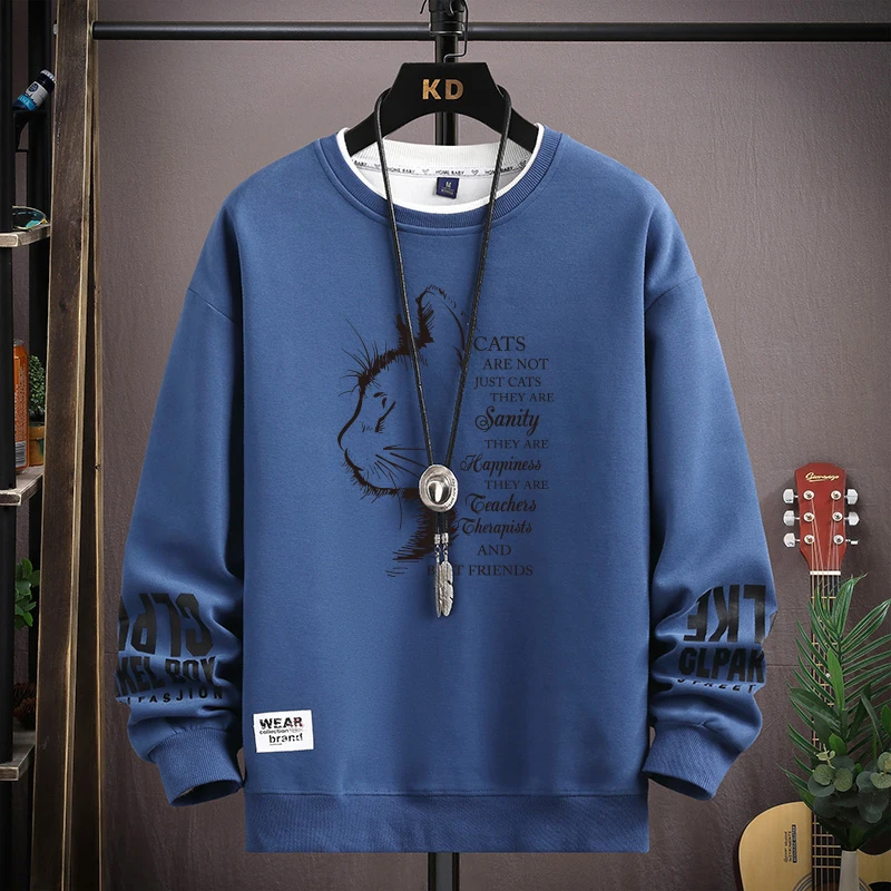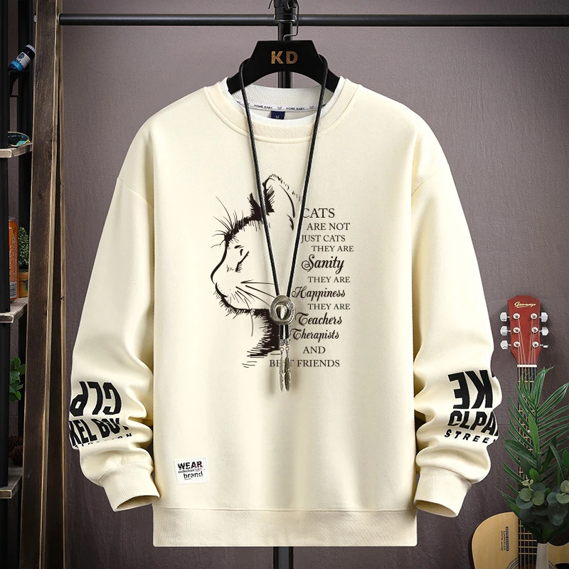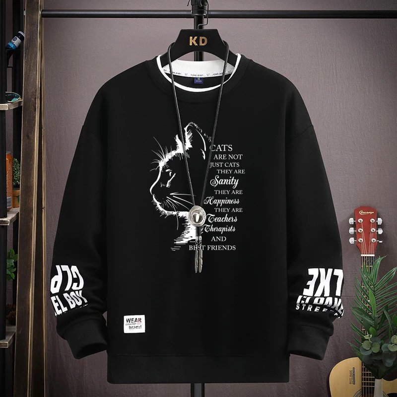 Stay stylish this season with our autumn mens sweatshirt featuring an exclusive sketch cat print, black O neck design, and Harajuku streetwear vibe — a comfortable long sleeve fashion top perfect for casual urban looks.