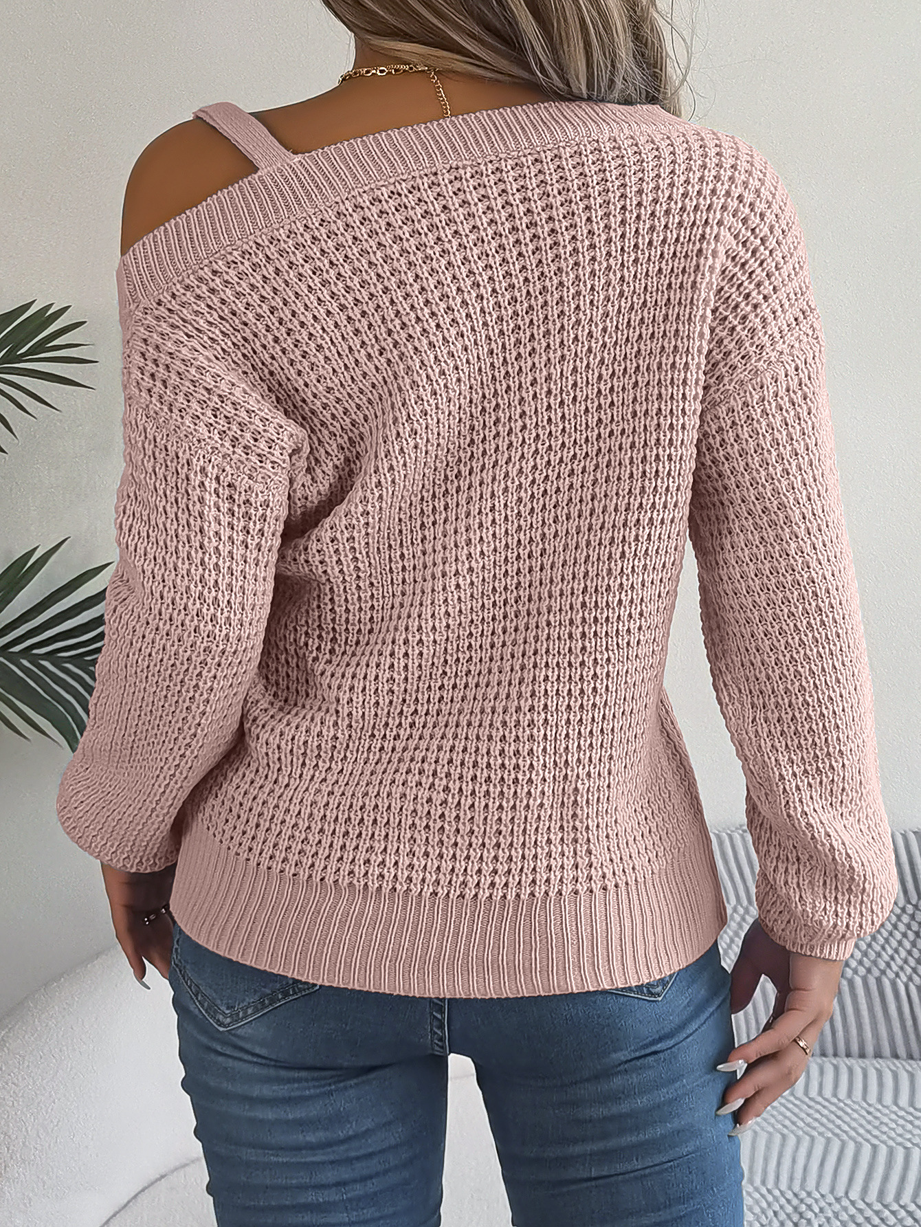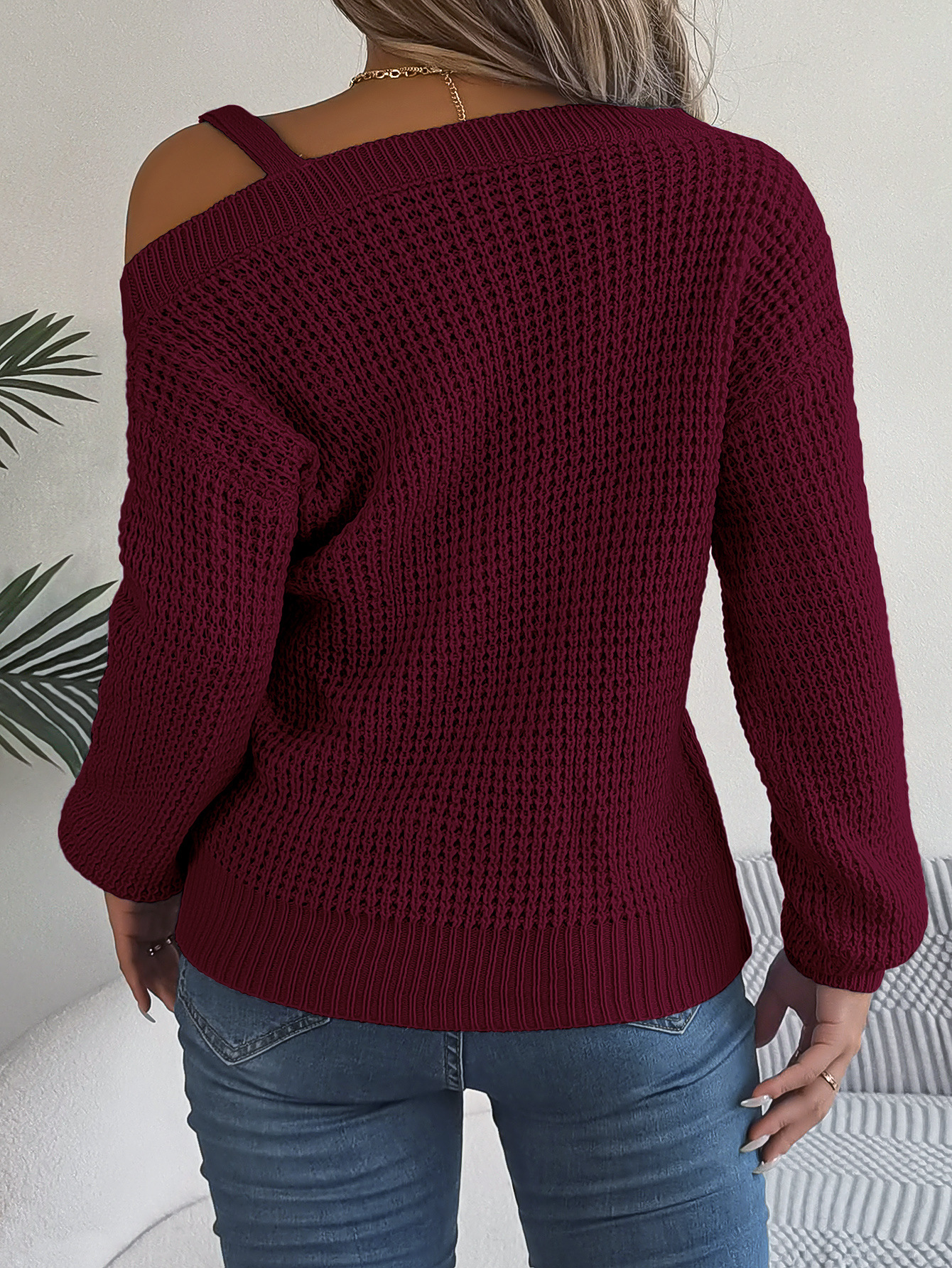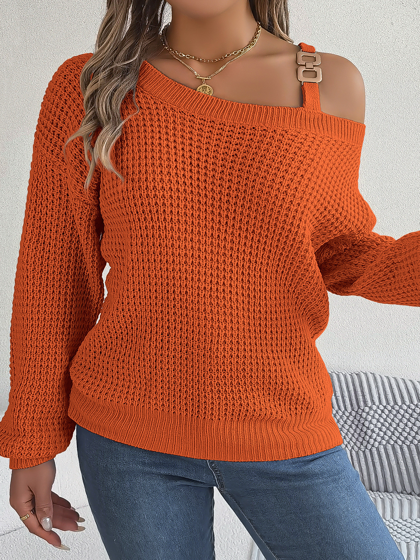 Autumn Winter Sexy Metal Buckle Off Shoulder Sweater Solid Color Slash Neck Lantern Long Sleeves Knitted Pullovers Women Clothes