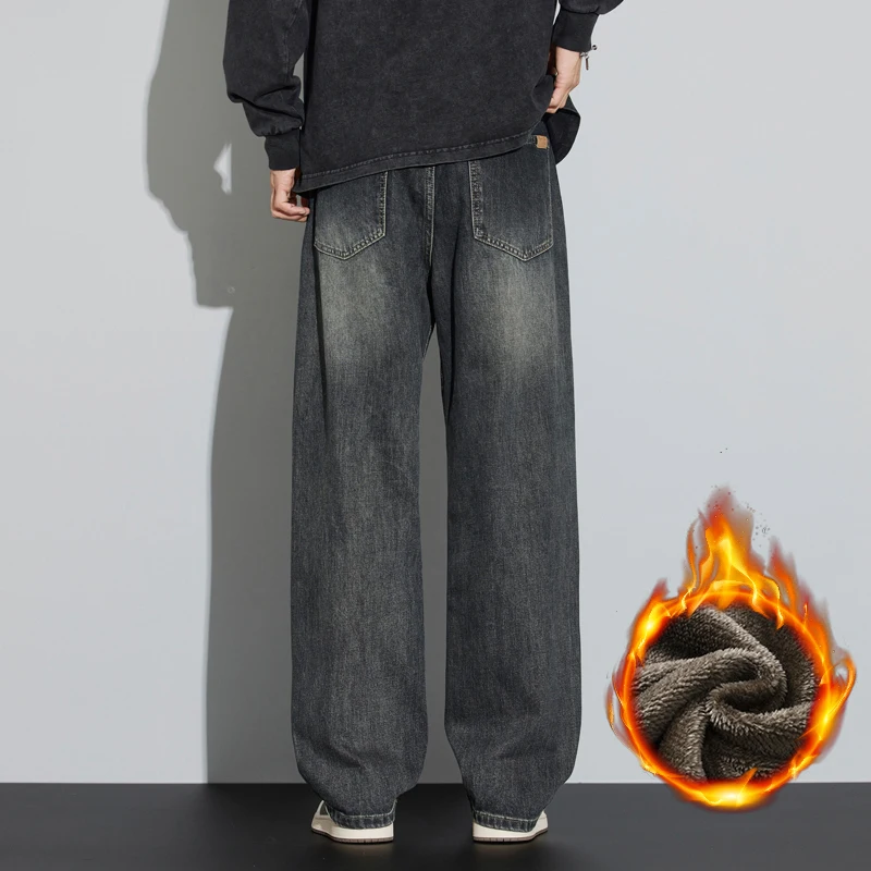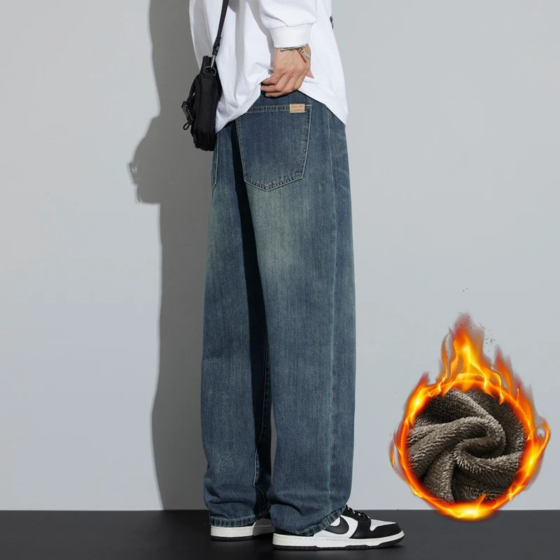 Mens Winter Fleece Wide Leg Jeans Thick Velvet Warm Loose Straight Denim Korean Fashion Casual Trousers