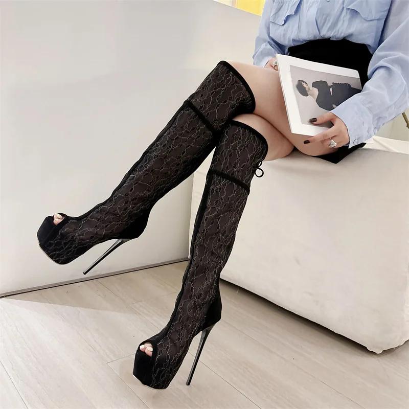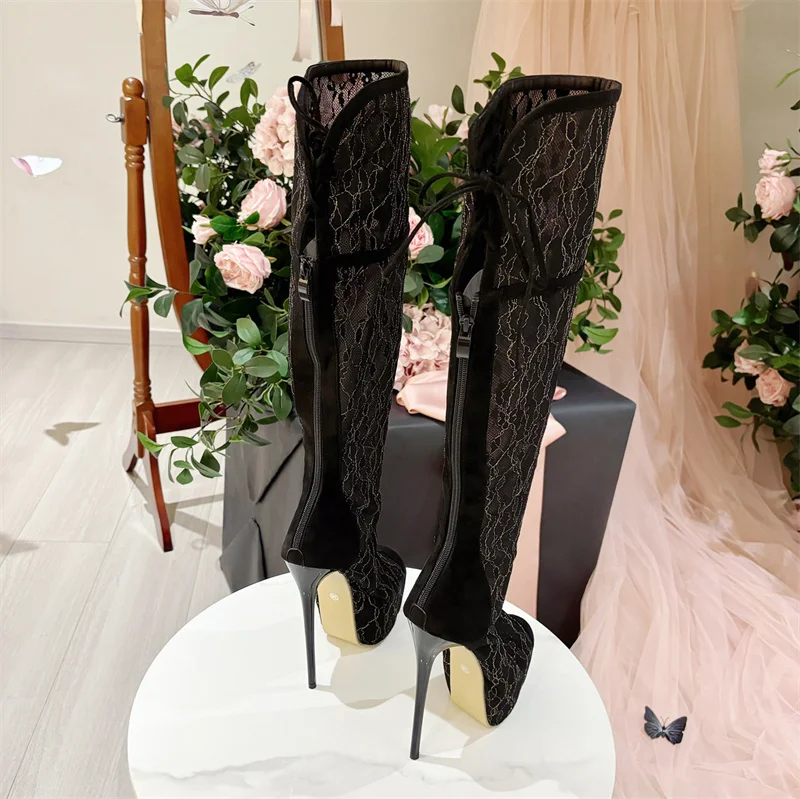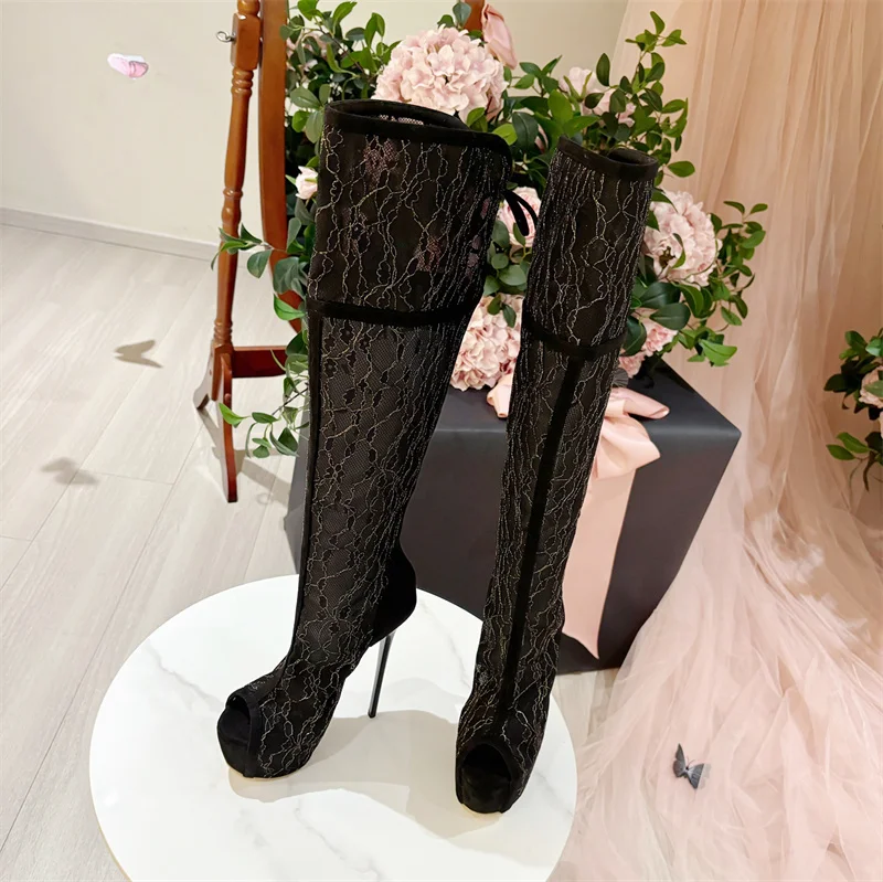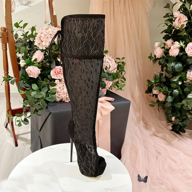 Sexy Black Knee-High Lace-Up Boots – Peep Toe High Heels for Summer Nights & Street Style