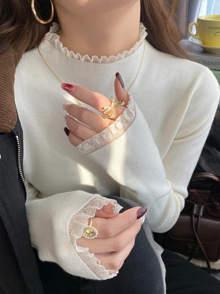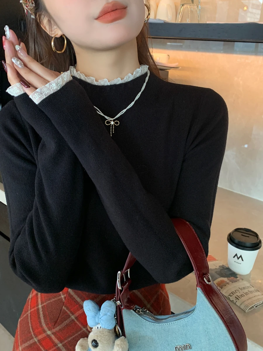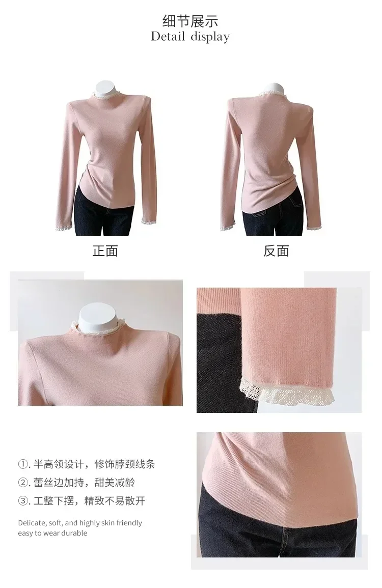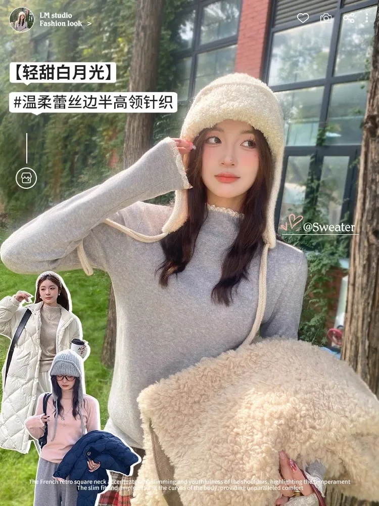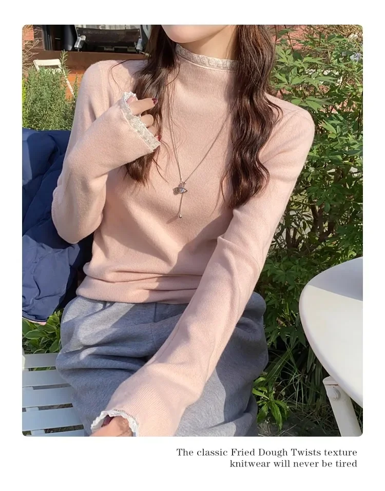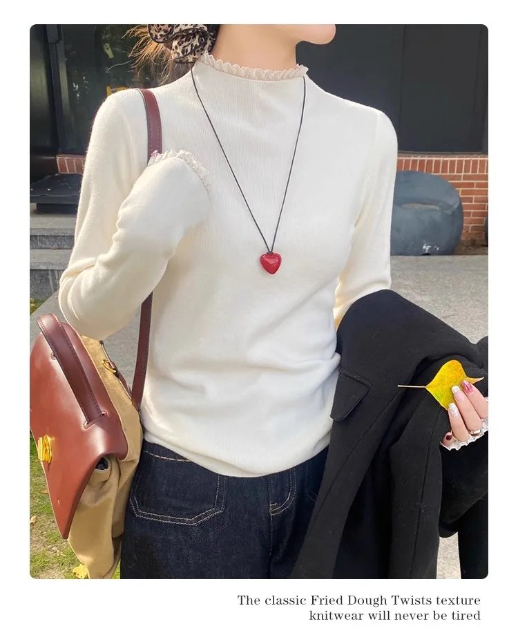Stay cozy and stylish this season with our 2025 lace semi high neck knit sweater for women. Perfect for autumn and winter, this slim fit mid-length top blends elegance with comfort for everyday wear.