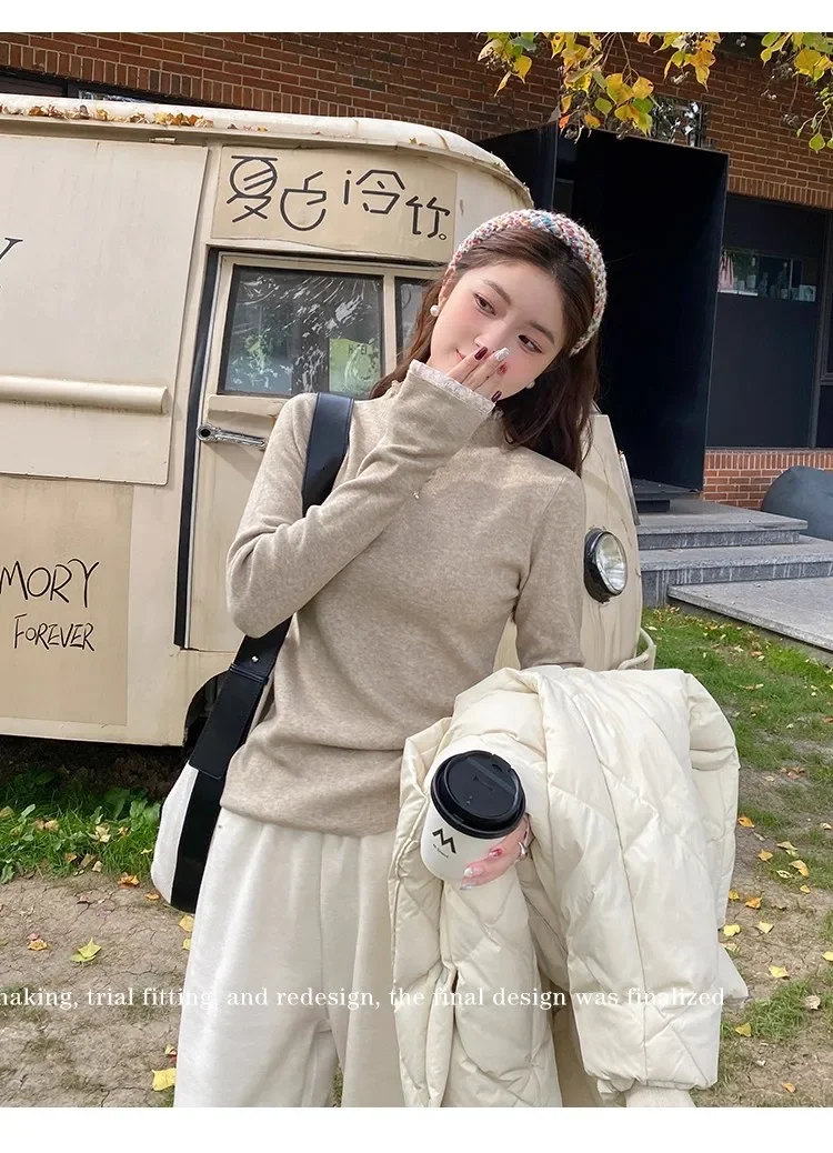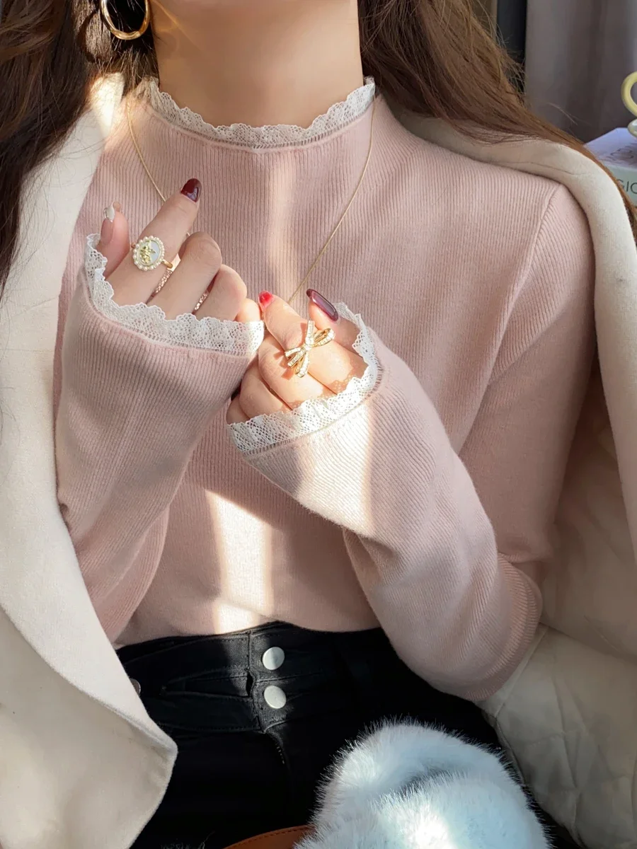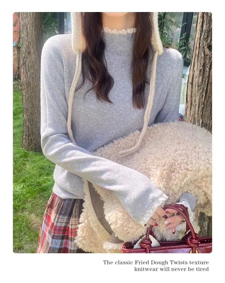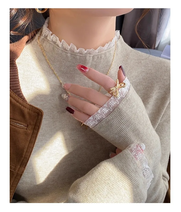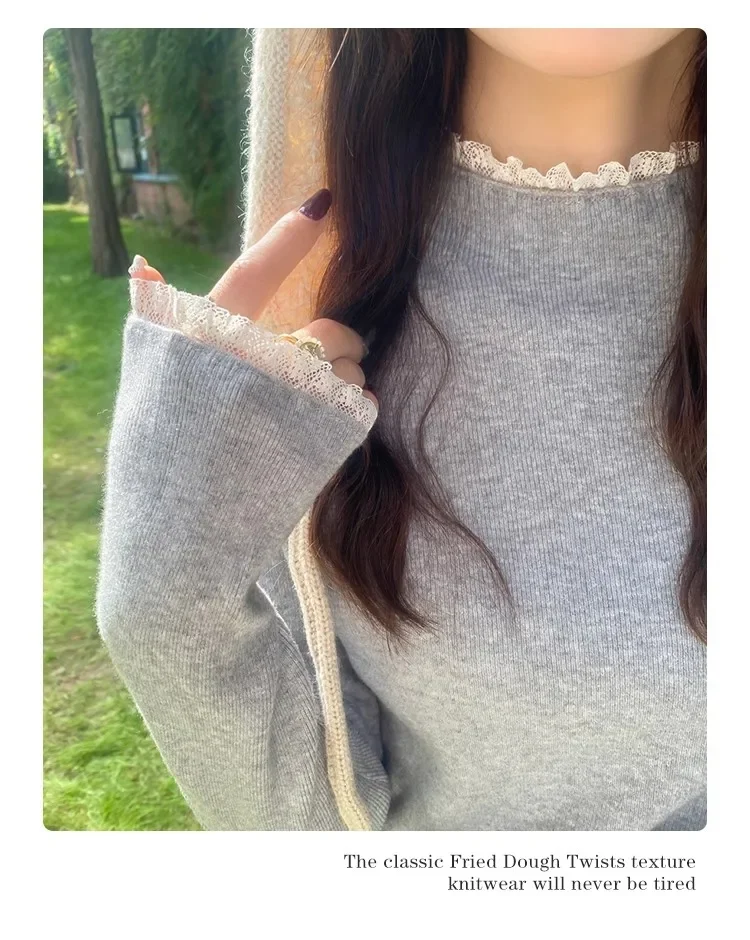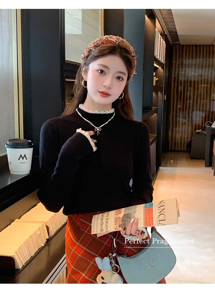 Stay cozy and stylish this season with our 2025 lace semi high neck knit sweater for women. Perfect for autumn and winter, this slim fit mid-length top blends elegance with comfort for everyday wear.