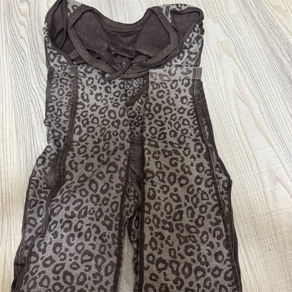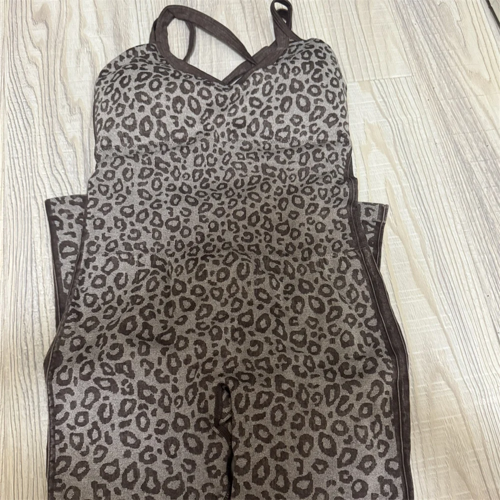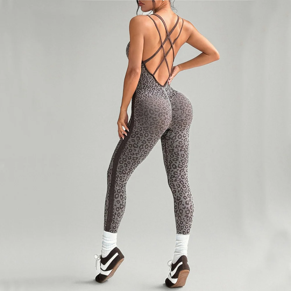 Upgrade your workout style with this seamless leopard yoga jumpsuit for women featuring a tight fit, hip lifting scrunch leggings, high stretch fabric, and breathable comfort for gym, yoga, and fitness training.