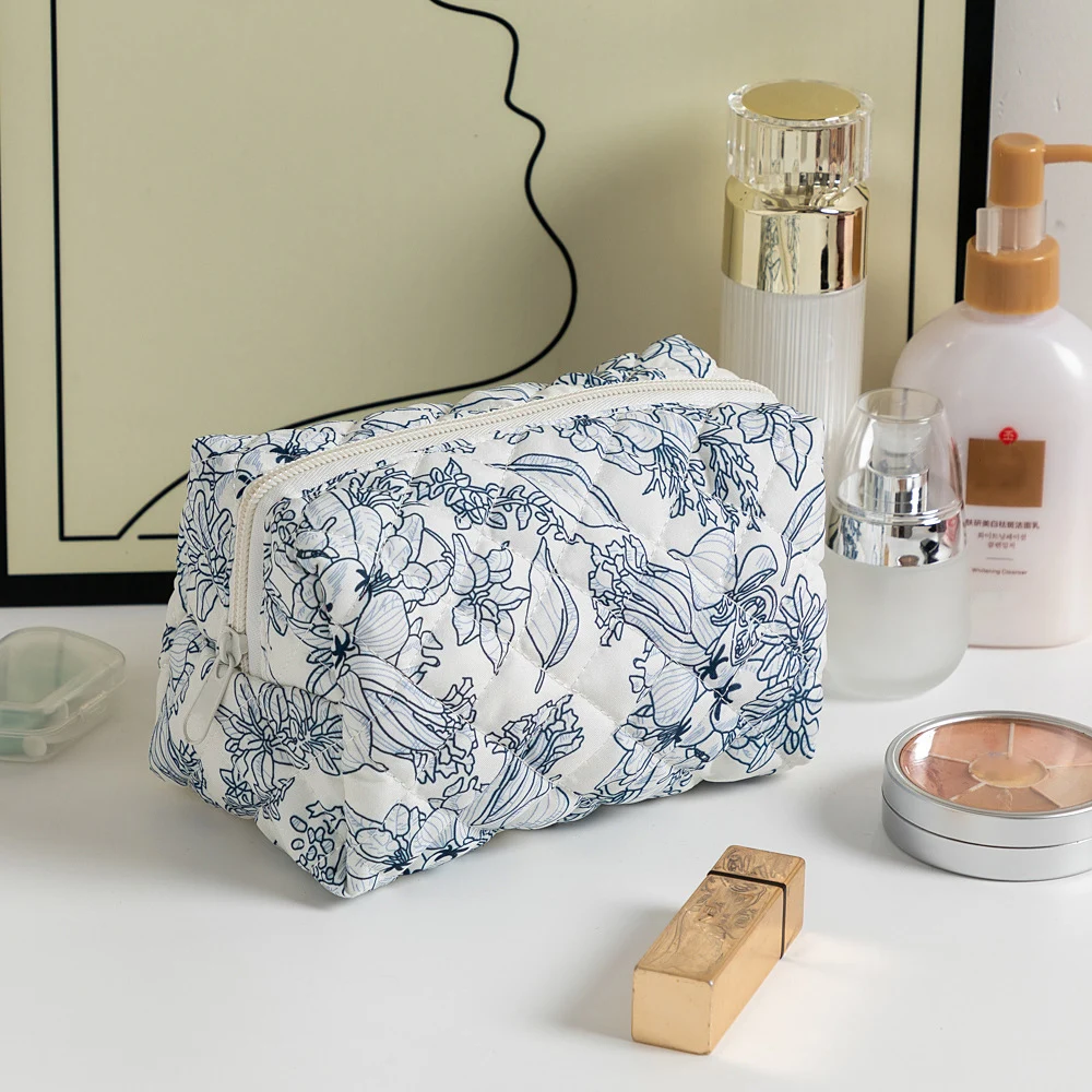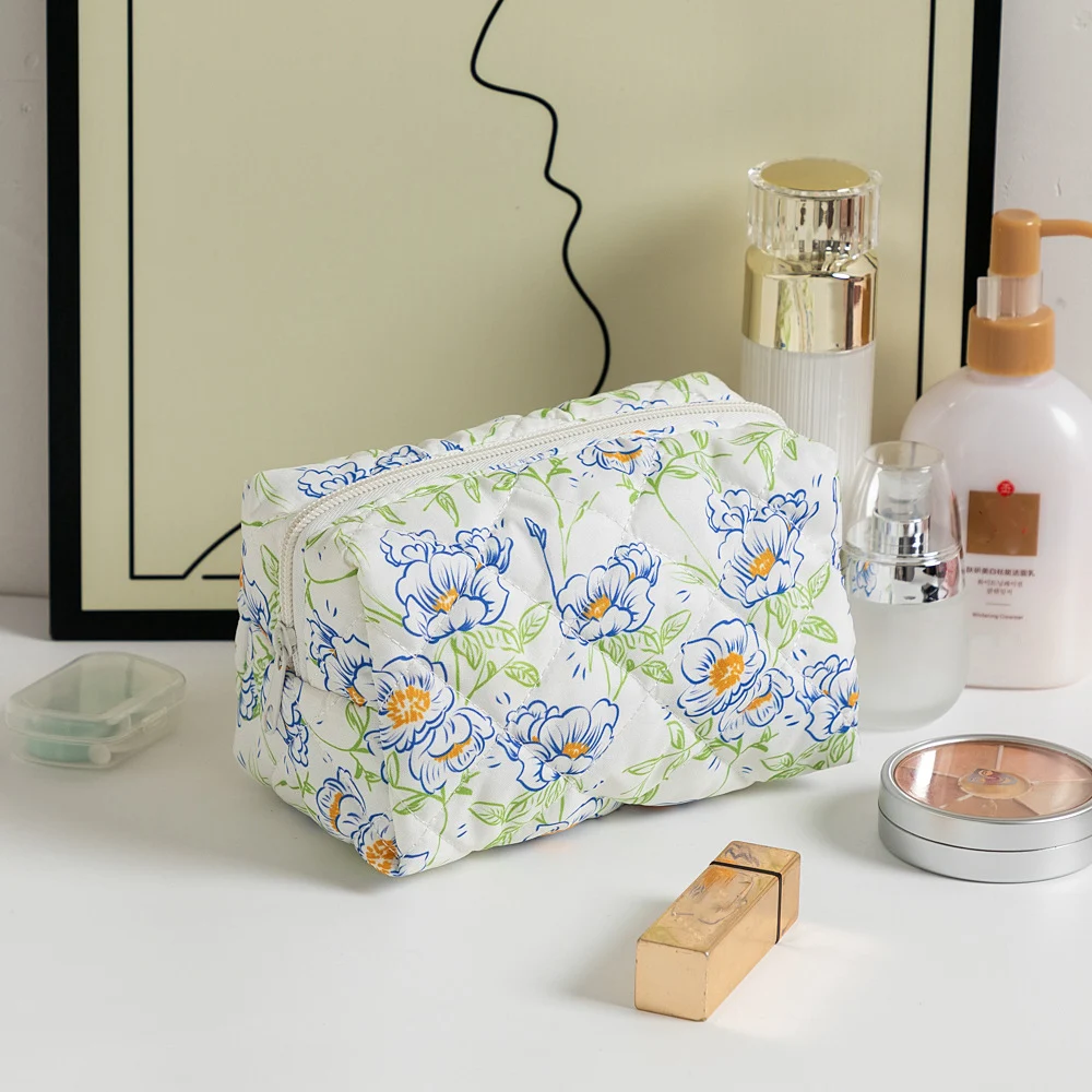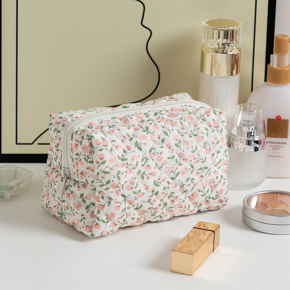 Discover a cute and durable floral quilted makeup bag designed for girls. Perfect for travel, this cosmetic and toiletry organizer keeps your essentials neatly stored in a stylish, lightweight pouch.
