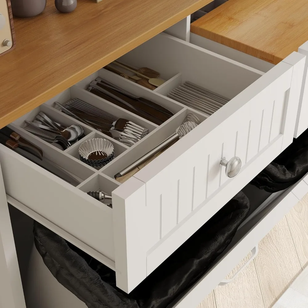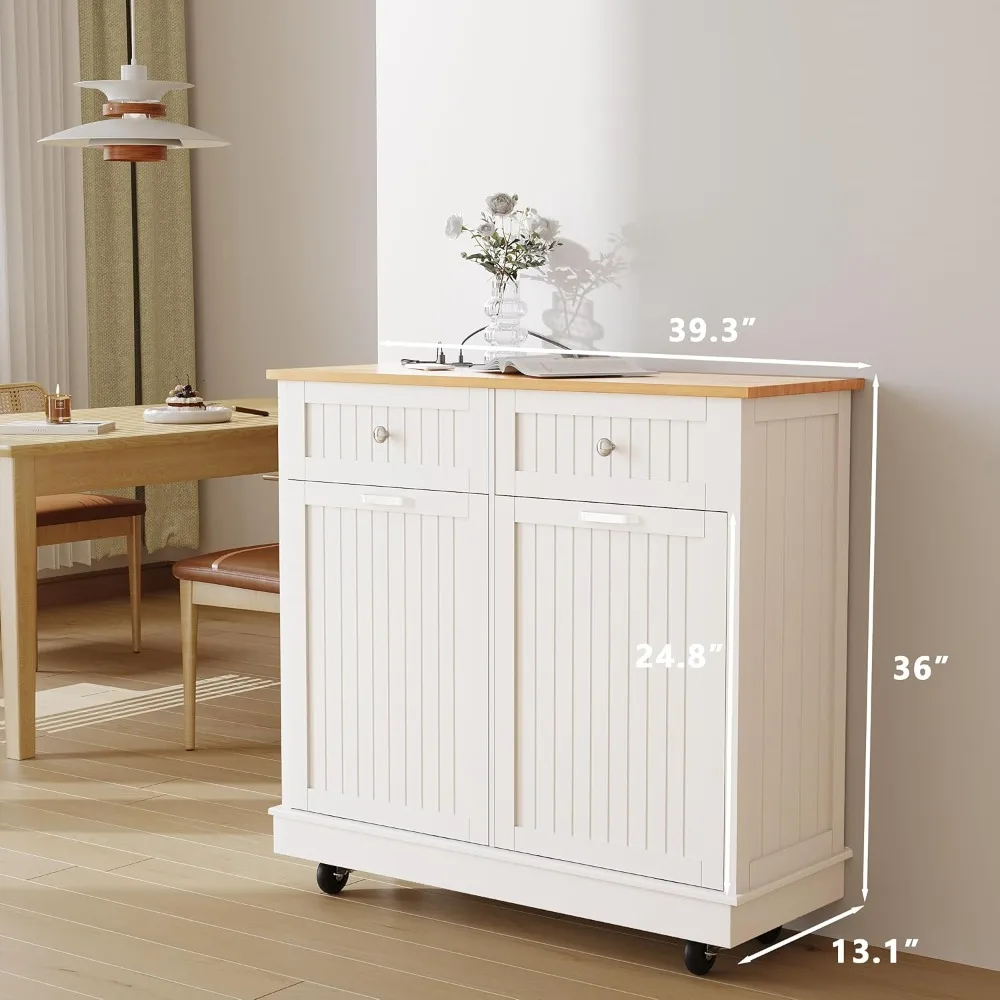 This item is a kitchen cabinet designed to keep your kitchen organized and your floors clean. It measures 39.3"L x 13.1"W x 36"H and features a trash can that prevents odors and keeps pets from knocking it over. Made from engineered wood, the freestanding buffet cabinet has a sturdy structure and can be easily moved as needed. The tilt-out trash can has a capacity of 10 gallons, hiding your trash while providing a cleaner kitchen floor. The wooden countertop offers additional space for organizing items. Assembly is straightforward with labeled accessories and instructions included in one package. This multi-functional cabinet is suitable for use in various settings, including homes, restaurants, cafes, and banquet halls.