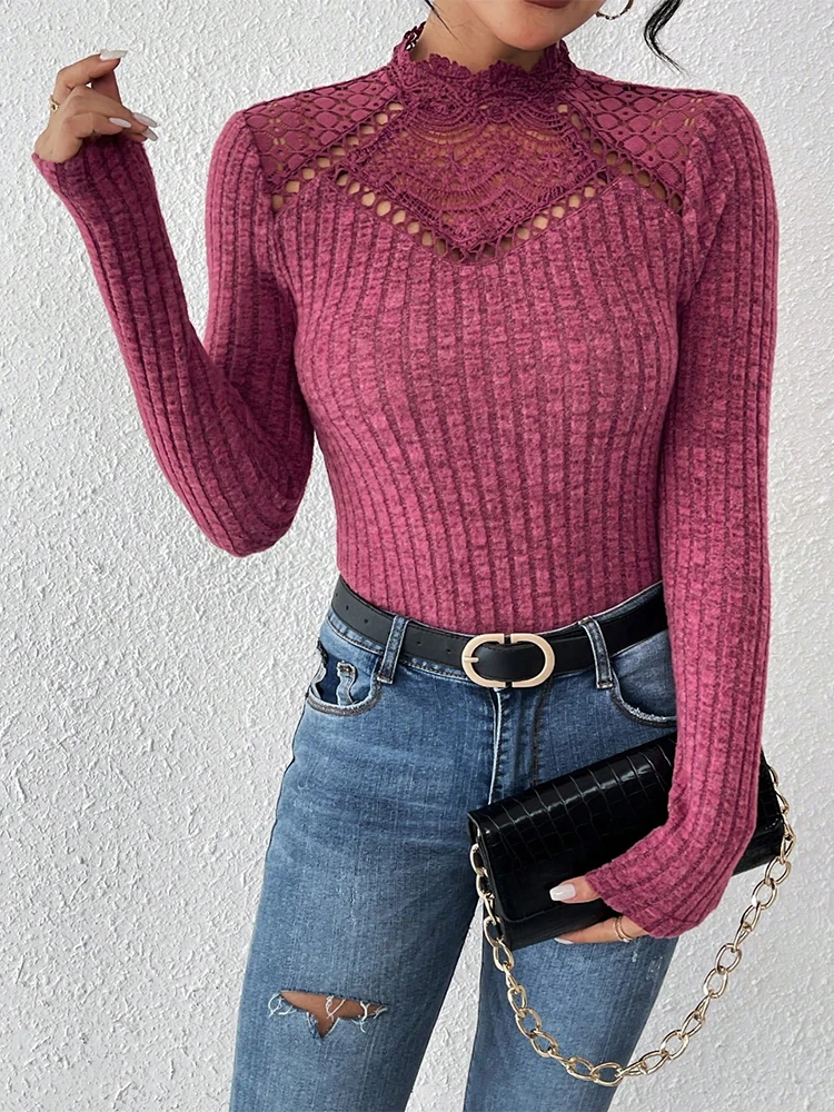 Women's Slim Fit High Neck Knitwear Spring Summer Fashion Chic Black Lace Patchwork Long Sleeve Thin Outerwear